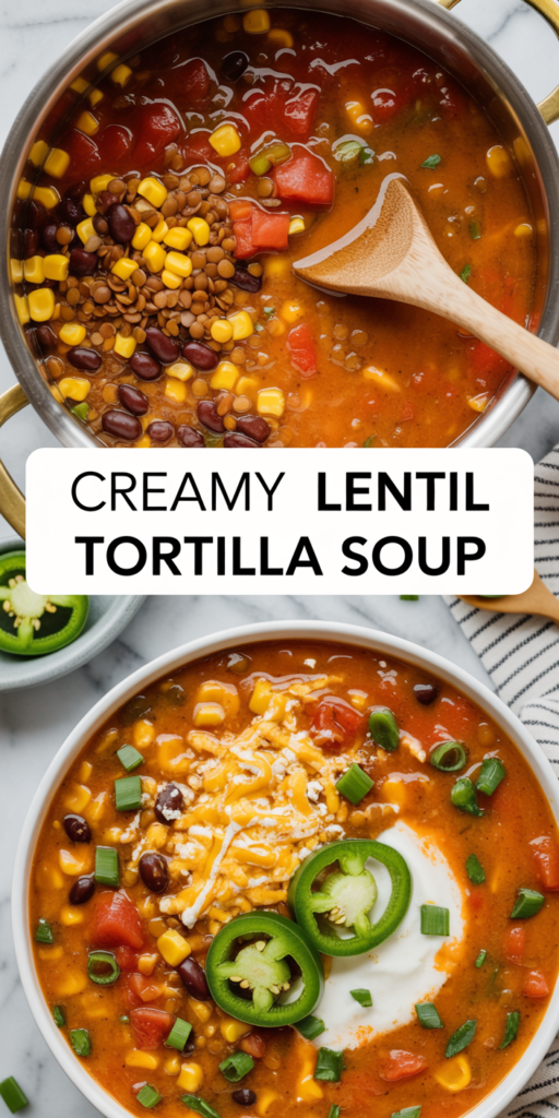 This one-pot tortilla soup recipe builds a thick, spoonable base from tomatoes, chiles, and lentils. I blend half the pot to get a silky mouthfeel without dairy.