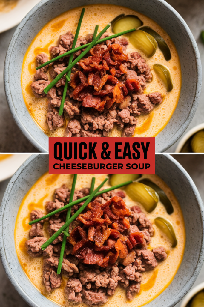 Top each bowl with crispy bacon, chopped pickles, and a sprinkle of cheddar for that bacon cheeseburger feel in spoonable form. The browned ground adds savory bite while the creamy base keeps every mouthful cozy.