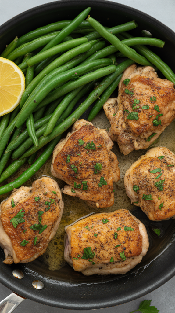 I call this my go-to Pan-Seared Chicken Thighs with Green Beans because it tastes like a real dinner but cooks fast in one skillet. In about 25–30 minutes you get golden-brown, crispy edges on the chicken and bright, tender-crisp green beans coated in a lemon-garlic pan sauce.